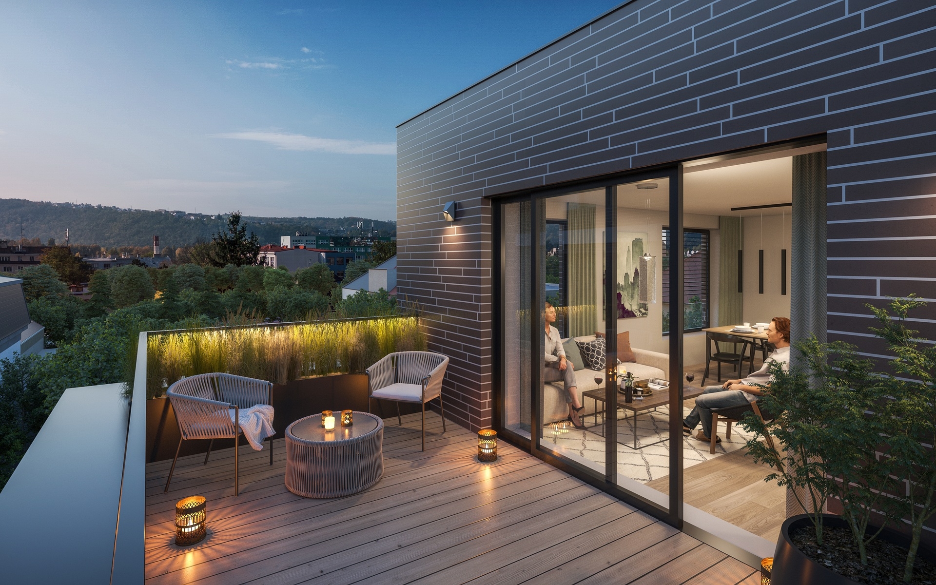 Celkové pojetí projektu pracuje s přírodními materiály, které podtrhují jeho rezidenční charakter a citlivě navazují na okolní vilovou zástavbu. Masivní dřevo je použito na terasách a balkonech, u velkoformátových oken i vyzdívaného oplocení. Přístupové chodníky jsou řešeny ze skládaného kamene a společné venkovní prostory doplňují rozmanité sadové úpravy.