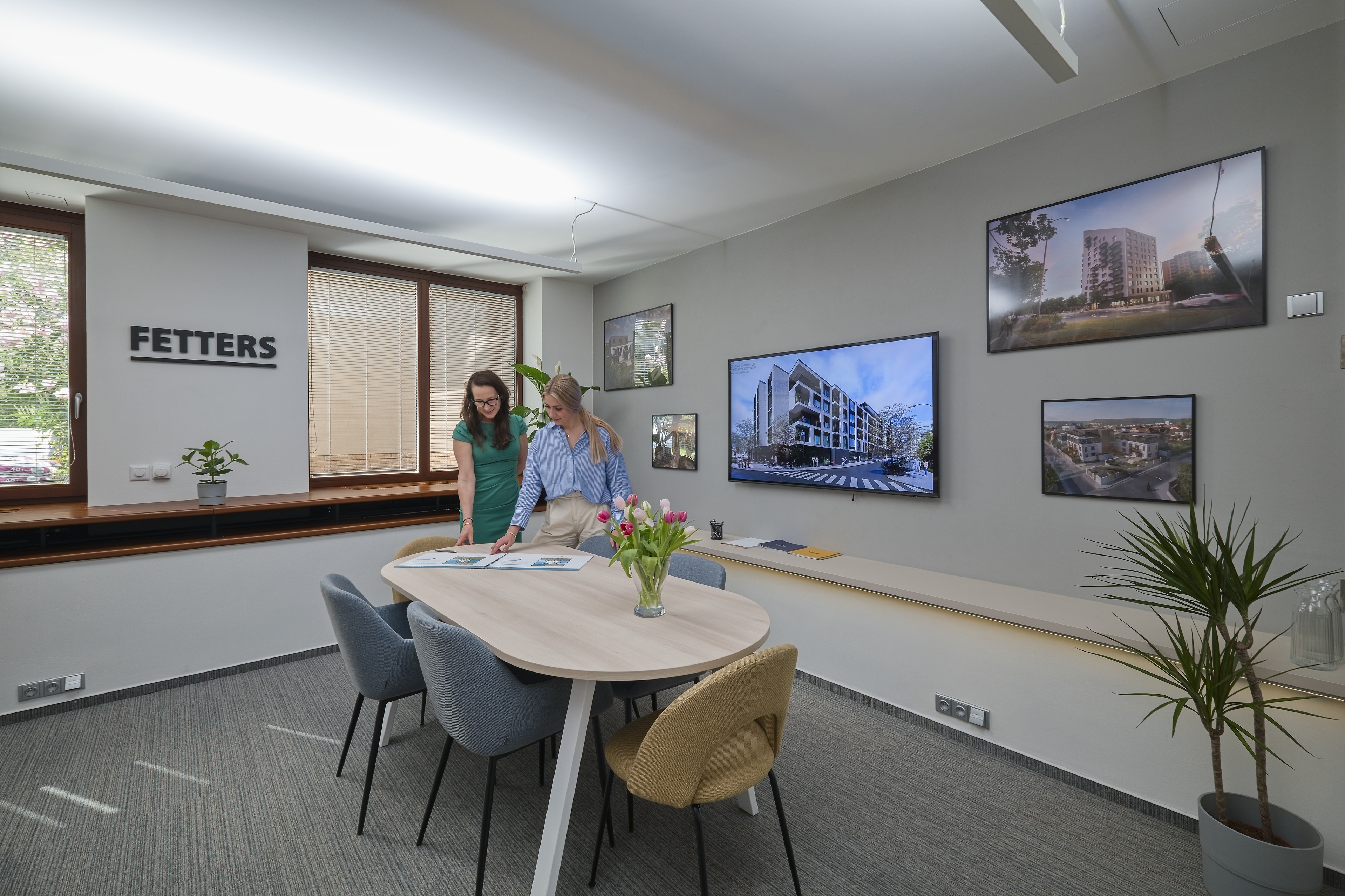 Klienti zde najdou zázemí pro individuální schůzky i podklady, které jim pomáhají udělat si konkrétnější představu o budoucím bydlení. Součástí prostoru jsou ukázky bytových standardů, projektové materiály, vizualizace i technické řešení prezentace, které umožňuje pohodlně projít jednotlivé projekty a jejich parametry.